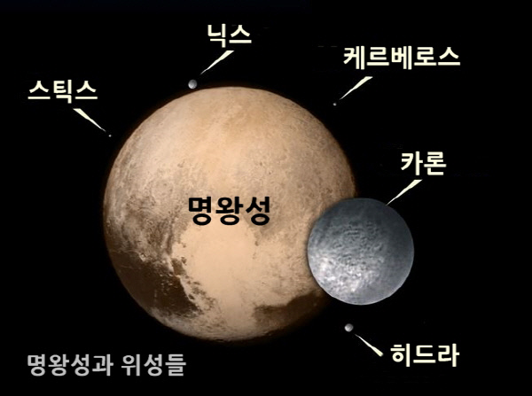 두번째로, 명왕성은 2만km 거리로 비교적 가깝게 붙어 있는 위성 카론과 함께 돈다. 명왕성은 카론, 스틱스, 닉스, 케르베로스, 히드라의 5개 위성을 갖고 있다. 가장 큰 카론은 크기가 명왕성의 절반에 이르며, 지구에서 관측하면 하나의 천체처럼 보인다. 명왕성이 발견된 것은 1930년이었고 카론은 1978년에야 존재가 알려졌다. 명왕성과 카론은 행성과 위성이 아닌 ‘이중 천체’로 봐야 한다는 주장도 있다.