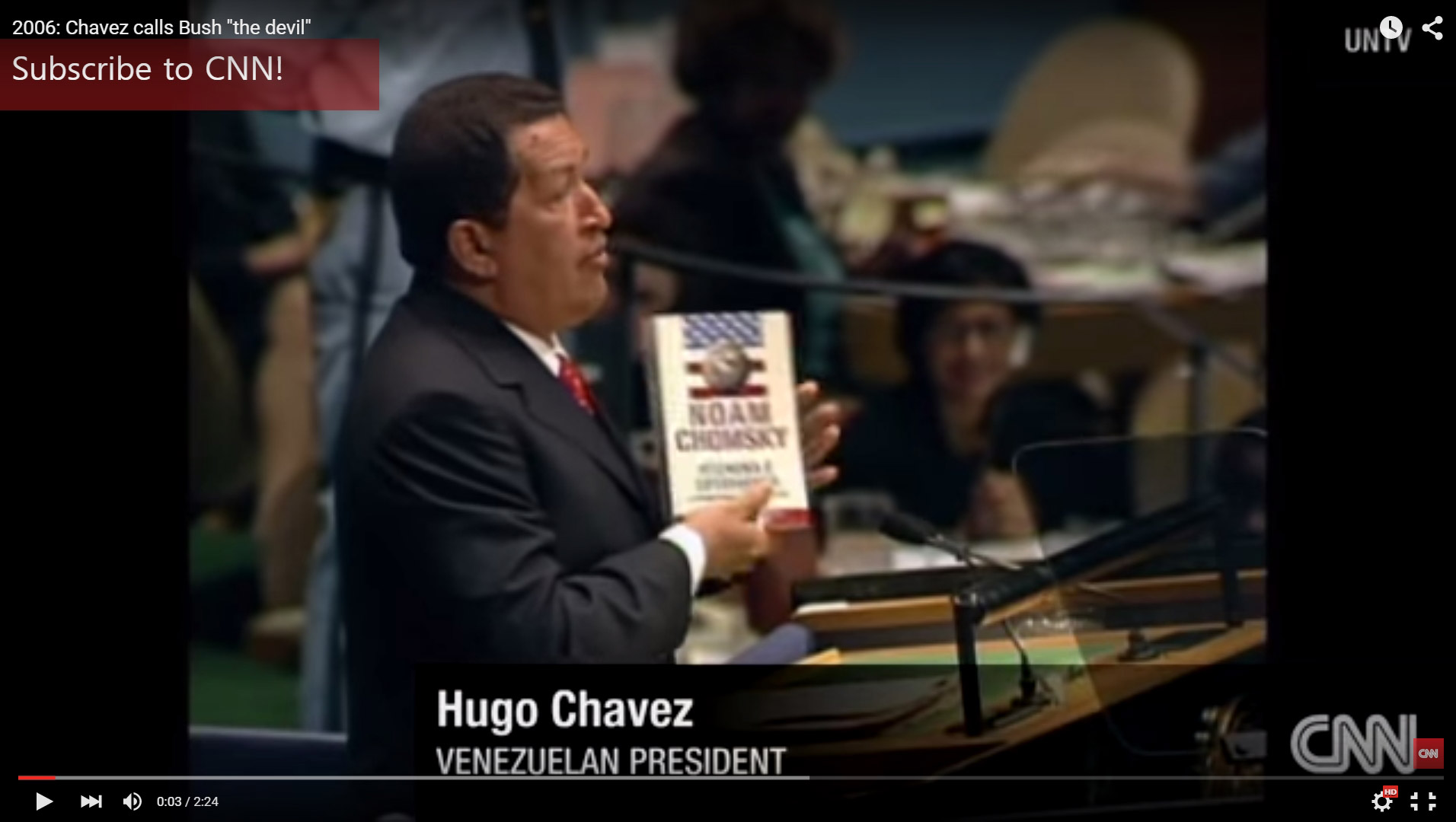 차베스는 이 연설을 하면서 미국의 비판적 지식인 노엄 촘스키의 책 <패권인가 생존인가>를 들어 보이기도 했습니다. 그러면서 “미 제국은 자신들의 지배 시스템을 강화하기 위해 할 수 있는 모든 짓을 합니다. 그들이 그렇게 하도록 놔둘 수는 없습니다. 세계 독재가 강화되도록 둘 수는 없습니다”라고 했습니다.