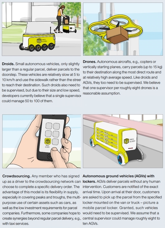혼잡한 도심에서 내 집 문앞까지, 저렴하게 혹은 공짜로 물건을 가져다주기를 기다리는 사람들이 많지만 그 비용을 낮추는 데에는 한계가 있다. 보고서는 결국 자동화된 운송수단을 이용한 배달이 늘어날 것으로 봤다. 자율주행차를 이용해 운전 인력을 줄이는 중간 단계를 거친 뒤에 ‘사람 없는 택배’가 현실화될 수 있다. 사물함이 달린 자율주행차(AGVs)를 이용해 물건을 가져다놓는 ‘AGVs-로커’ 모델이나 드론 택배가 앞으로 늘어날 가능성이 높다는 것이다. 매킨지는 드론 택배가 2025년 미국에서만 25만건에 이를 것으로 예상했다.