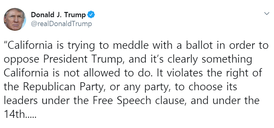 CNN방송 등 미국 언론들은 트럼프와 공화당전국위원회(RNC)가 7일(현지시간) 대선 예비후보들에게 반환받은 소득세 내역을 의무적으로 공개하도록 한 캘리포니아주 법이 “위헌적”이라며 주 법원에 소송을 제기했다고 보도했다. 트럼프의 변호인인 윌리엄 콘소보이는 캘리포니아주 동부지역법원에 낸 소장에서 이 법이 “위헌적인 자격기준”을 요구하는 것이며, 대선 후보로 나서려는 이들에게 ‘부당한 경제적 부담’을 지우는 것이라고 주장했다. RNC는 이 법이 “미국 대통령을 겨냥한 노골적인 공격”이라고 비난했다. 같은 날 ‘공화당 유권자들’이라 주장하는 이들 명의로도 RNC를 통해 비슷한 소송이 제기됐다.