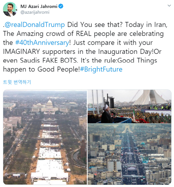 올 2월 11일에는 이슬람혁명 40주년 기념식 때 테헤란 시내에 모인 군중들의 사진을 올리면서 “트럼프 대통령 보고 있나? 당신의 ‘상상 속’ 취임식 군중들과 달리, 이것이 ‘진짜’ 군중들이다”라고 썼다. 2017년 1월 20일 트럼프 대통령 취임식 참석자 수는 미국에서도 거센 논란거리였다. 백악관은 “사상 최대 인원이 참석했다”고 했지만 인파는 적었고 워싱턴의 내셔널몰 광장은 텅 비었으며, 심지어 백악관이 참석자 수를 부풀리려고 사진을 조작했다는 보도까지 나왔다. 자흐로미는 트럼프에게 취임 첫 날부터 망신을 안겨준 이 사건을 거론한 것이다.