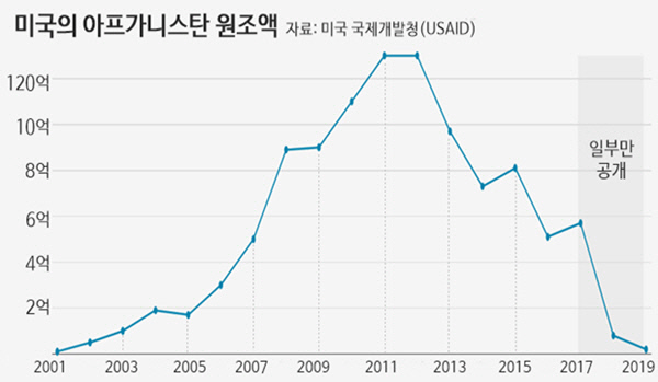 가장 큰 피해를 입은 것은 아프간 사람들이다. 미국의 아프간 원조액은 2012년 연간 130억달러 규모에 이르렀으나 이후 계속 줄었고 지난해에는 8억달러에 그쳤다. AP통신은 “미군이 떠날 준비를 할 때 아프간 아이들 200만명은 영양실조에 시달린다”고 지적했다.