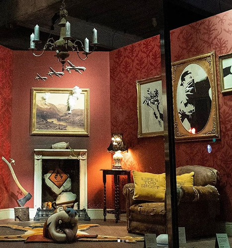 남기는 흔적마다 이슈가 되는 뱅크시가 이번엔 런던 남쪽에 ‘가게’를 열었다. 붉은 벽지로 둘러싸인 상점 안에 만화 캐릭터 ‘호랑이 토니(Tony the Tiger)’의 양탄자가 깔려 있다. 소파는 낡아 너덜너덜하고, 지지직거리는 TV 화면에는 혀를 내민 소년의 모습이 보인다. 영상 위에는 “위기는 일상”이라는 글이 쓰여 있다. 영국 국기 유니온잭이 그려진 보호용 조끼도 눈에 띈다. 가수 스톰지가 공연에서 입었던 것이다.