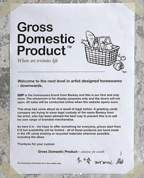 뱅크시는 처칠스트리트에 이 가게를 만든 뒤 1일(현지시간) 인스타그램에 사진들을 올리고 ‘개점’을 알렸다. “오늘 가게를 열지만 문은 실제로는 열리지 않습니다.” 뱅크시가 올린 글에서 알 수 있듯이 진짜로 물건을 파는 가게는 아니다. 쇼윈도로 들여다볼 수 있는 가짜 가게이고, 2주 뒤면 사라진다. 상점 이름을 딴 웹사이트(grossdomesticproduct.com)도 있지만 접속해보면 “곧 개점합니다”라는 메시지만 뜬다.