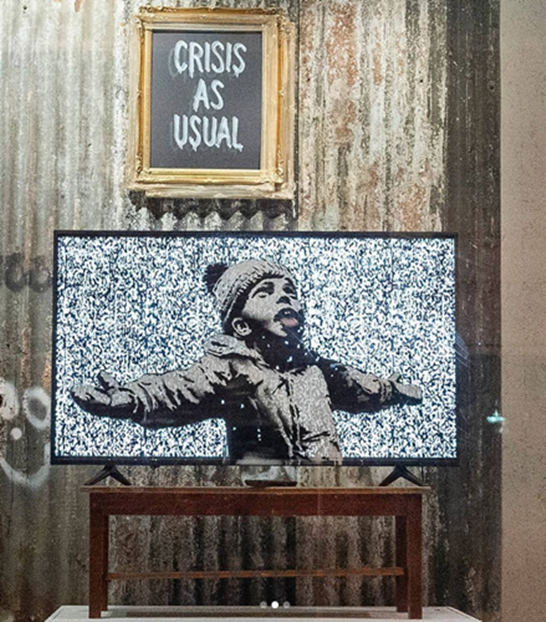 남기는 흔적마다 이슈가 되는 뱅크시가 이번엔 런던 남쪽에 ‘가게’를 열었다. 붉은 벽지로 둘러싸인 상점 안에 만화 캐릭터 ‘호랑이 토니(Tony the Tiger)’의 양탄자가 깔려 있다. 소파는 낡아 너덜너덜하고, 지지직거리는 TV 화면에는 혀를 내민 소년의 모습이 보인다. 영상 위에는 “위기는 일상”이라는 글이 쓰여 있다. 영국 국기 유니온잭이 그려진 보호용 조끼도 눈에 띈다. 가수 스톰지가 공연에서 입었던 것이다.