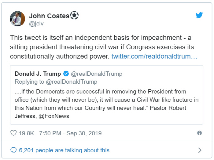 트럼프 대통령은 이날 트위터에 “만일 민주당원들이 대통령을 자리에서 몰아내는 데에 성공하면 내전을 야기할 수 있고 우리 조국은 그 상처를 치유할 수 없을 것”이라며 “로버트 제프리스 목사가 폭스뉴스에서 이렇게 말했다”고 썼다. 민주당 주도로 하원이 탄핵 조사에 들어간 상황에서, 자신이 탄핵되면 국가가 무너진다고 주장한 것이다. 트럼프의 이 글에는 몇 시간 만에 수만 명이 ‘좋아요’를 눌렀고, 2만회 가까이 리트윗됐다.