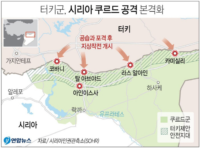 터키군은 라스알아인과 탈아브야드, 코바니 등 시리아의 국경도시 여러곳을 동시에 폭격하고 군을 투입하고 있는 것으로 전해졌다. YPG가 주축이 된 시리아민주군(SDF)은 트위터에서 “SDF 전사들이 탈아브야드 지역을 공격해온 터키군을 격퇴했다”고 주장했다. 그러나 군사력에서 터키군에 비교되지 않는 쿠르드민병대가 아무리 거세게 반격한들, 민간인 희생을 막기는 힘들 것으로 보인다.