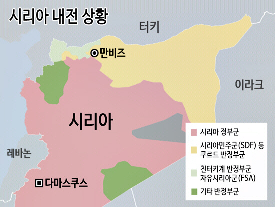 2011년 내전이 시작된 뒤 만비즈는 바샤르 알아사드 독재정권에 맞선 반정부군에 장악됐다. 그러다가 이슬람국가(IS)에 점령당했고, 얼마전까지는 쿠르드민병대가 주축이 된 시리아자유군(SDF)과 쿠르드 자치정부의 영역이었다. 정부군이 이 지역에 들어온 것은 2012년 이후 처음이다.