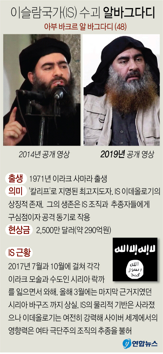 시리아에서 연합군과 쿠르드민병대가 극단주의자들과의 전면전에 나서면서 IS 세력은 무너지기 시작했다. 1년 가까이 조용했던 알바그다디는 지난해 8월 메시지에서 불리한 전황을 인정하면서 ‘역량을 보전’하라고 지시했다. 올들어서 그의 생존이 확인된 것은 4월 29일이었다. 5년만에 음성만이 아닌 동영상을 공개했는데, 중상설을 일축하려는 듯 공격용 라이플을 든 모습이었다.