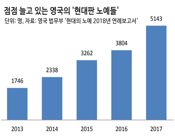 영국에선 21세기에도 사라지지 않은 ‘노예노동’이 몇 해 전부터 이슈가 됐다. 지난해 10월 영국 정부가 발표한 '현대의 노예 2018 연례 보고서'를 보면 노예상태의 노동자들은 점점 늘어나 2017년 5000명을 넘어섰다. 대부분이 밀입국한 이주자들이었다.