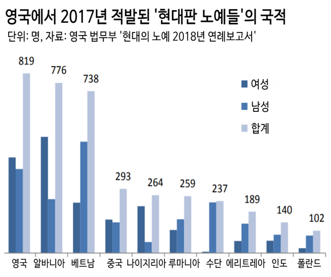 영국에선 21세기에도 사라지지 않은 ‘노예노동’이 몇 해 전부터 이슈가 됐다. 지난해 10월 영국 정부가 발표한 '현대의 노예 2018 연례 보고서'를 보면 노예상태의 노동자들은 점점 늘어나 2017년 5000명을 넘어섰다. 대부분이 밀입국한 이주자들이었다.
