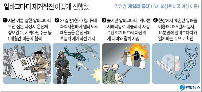미군이 제거작전에 착수한 것은 5개월 전이다. 은신처는 알바그다디의 부인을 체포해 알아냈다. 몇 주 전 부인과 연락책을 붙잡아 심문을 했고, 이라크 국가정보국과 쿠르드족이 주축이 된 시리아민주군(SDF) 등을 통해 이들에게서 얻은 은신처 정보를 확인했다. 26일 자정(현지시간) 쯤 CH-47 군용헬기 8대가 이라크 아르빌의 군사기지를 떠나 시리아 국경을 넘었다. 이들리브 상공을 통제하던 러시아군이 하늘길을 열어줬다.