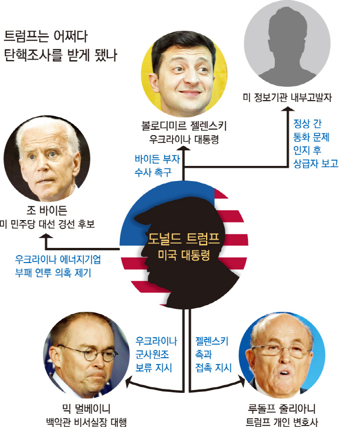 발단은 정보기관의 내부고발이었다. 트럼프 대통령과 볼로디미르 젤렌스키 우크라이나 대통령의 통화, 그리고 이를 비판한 내부고발자의 항의로 촉발된 ‘우크라이나 스캔들’은 등장인물도 많고 진행과정도 복잡하다. 하루가 머다하고 증인을 소환해온 하원은 30일(현지시간)에는 트럼프 대통령과 갈등을 빚다 밀려난 존 볼턴 전 백악관 국가안보보좌관에게 출석을 요구했다. 우크라이나 스캔들에 관련된 인물들의 행위와 전개 과정을 정리해본다.