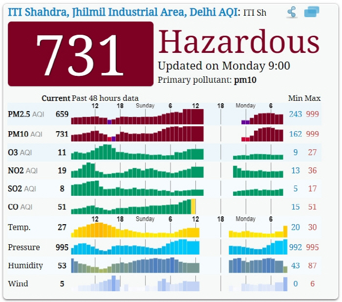 실시간 대기질지수 자료(aqicn.org)에 따르면 4일 오전 9시(현지시간) 델리의 미세먼지(PM10) 농도는 731로 서울(25)의 29배, 베이징(104)의 7배를 기록했다. 전날인 3일에는 대기질지수(AQI)가 1000 가까이 육박하기도 했다. 미세먼지·초미세먼지와 이산화질소 등의 농도를 종합해 측정되는 이 지수는 400이 넘으면 매우 유독한 것으로 분류된다. 회색빛 먼지가 시야를 가려 항공기 900편 가까이가 결항하거나 연착·회항하기도 했다.