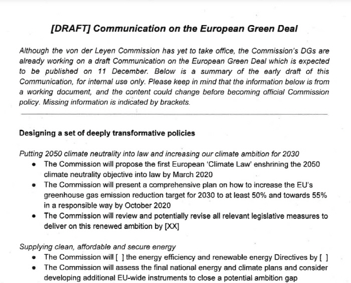 무엇보다 관심을 끄는 것은 11일 발표될 EU의 ‘그린딜’이다. 민간기구 유랙티브 등이 입수해 공개한 초안에 따르면 그린딜의 핵심은 순환형 경제를 통해 2050년까지 유럽을 ‘탄소중립 대륙’으로 만들겠다는 것이다. 내년 2월까지 ‘2030 생물다양성 전략’을 제시하고, 3월에는 순환경제 행동계획과 그에 따른 산업전략을 발표한다. 내년 상반기까지 녹색금융 계획을 세우고 대기·수질오염물질 배출 제로 계획도 내놓는다. 10월엔 2030년까지 온실가스 배출량을 줄이는 포괄적인 일정을 제시한다. 내년 말에는 EU 차원의 총체적인 기후변화 적응전략을 내놓기로 했다.