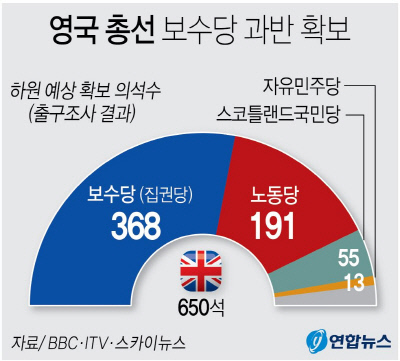 BBC와 스카이뉴스, ITV 등 방송 3사가 이날 오후 10시 투표 마감 직후 발표한 공동 출구조사에 따르면 보수당은 하원 650석 중 과반인 326석을 훌쩍 넘기는 368석을 확보한 것으로 나타났다. 보수당이 2년 전 총선 때보다 50석을 더 차지한 것과 반대로, 노동당은 이번에 191석을 얻어 71석이나 줄었다.