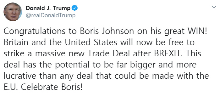 반면 도널드 트럼프 미국 대통령의 ‘영국 총선 논평’은 메르켈 총리와는 매우 달랐다. 트럼프 대통령은 13일 트위터에 올린 글에서 “보리스 존슨이 대단한 승리를 한 것을 축하한다”며 “영국과 미국은 이제 자유롭게 새로운 거대한 무역협상을 할 것”이라고 적었다. 트럼프 대통령은 “이 협상은 EU와 (영국이) 맺을 수 있는 어떤 협상보다도 이득이 많고 큰 것이 될 잠재력이 있다”고 주장했다.