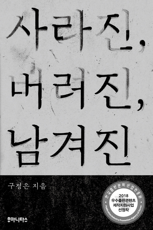 『사라진, 버려진, 남겨진』에 담긴 구정은의 글에 대해 이보다 적확한 표현은 없다. 『사라진, 버려진, 남겨진』은 모두 네 개의 장으로 되어 있다. 그 중 셋은 책 제목에도 보이는 것처럼 「남겨진」, 「버려진」, 「사라진」 그리고 책 제목에는 드러나 있지 않지만, 「보이지 않는」이 그것이다. 첫 번째 장인 「남겨진」은 주로 국제분쟁 현장에서 파괴된 유적에 대한 내용을 담고 있다. ‘남겨진’의 의미에 대해 그는 이렇게 말한다.