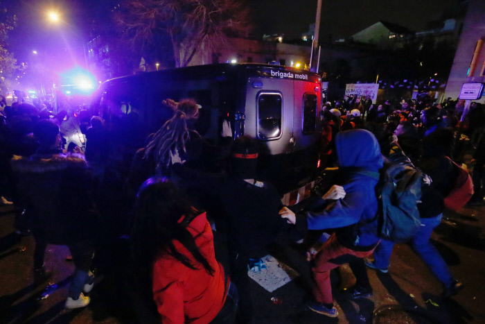 시위대가 경찰차를 밀어댑니다.