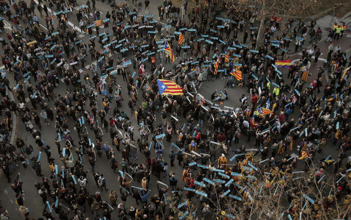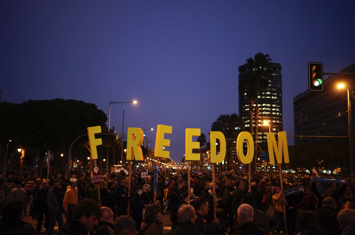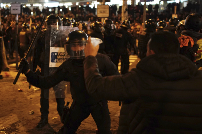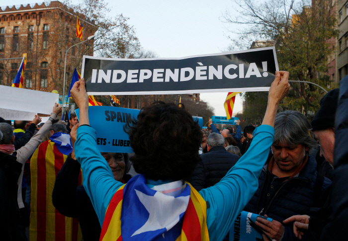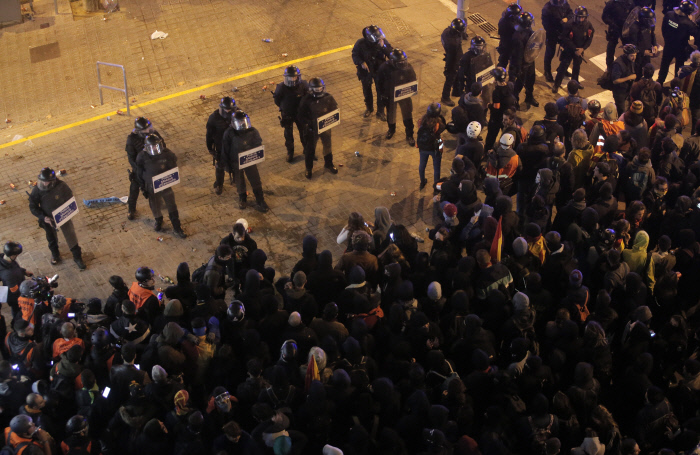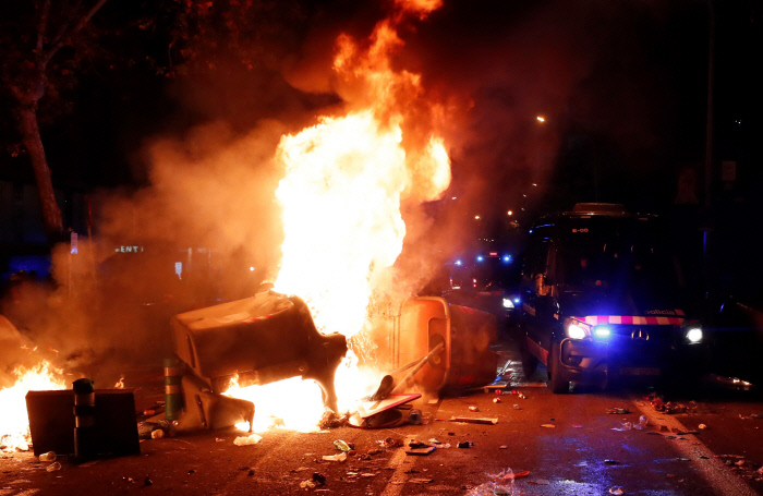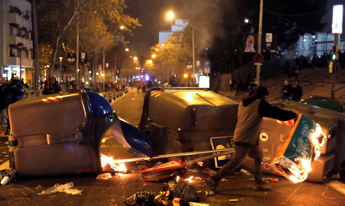 불길 속에서 카탈루냐 독립을 상징하는 ‘에스텔라다’ 깃발을 흔드는 시위대.