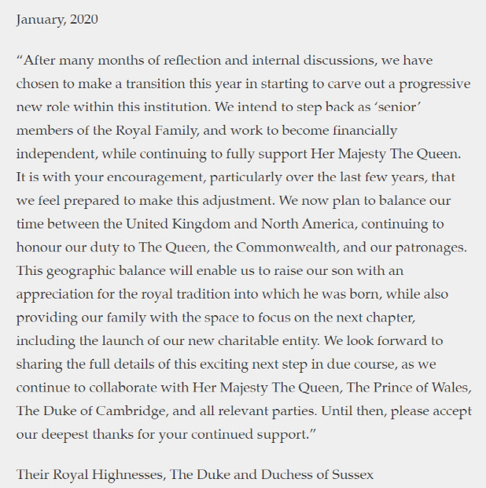 결국 해리는 지난 8일 말 많고 탈 많은 왕실 생활을 청산하고 개인의 삶을 찾겠다고 선언했고, 재정적으로도 독립하겠다고 했다. 그러나 세금과 보안 문제, 왕실 규정 등이 있기 때문에 재정적 관계를 완전히 끊을 수 있을 지는 불확실하다.