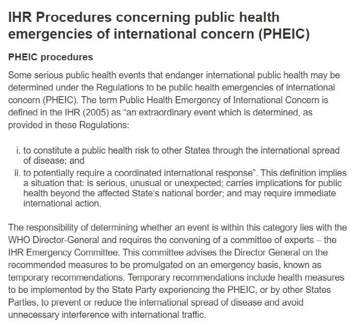 이 규정에 따르면 ‘공중보건의 위험이 한 나라에서 다른 나라들로 전파될 수 있을 때’, ‘국제적인 공동대응이 요구될 가능성이 있을 때’ 비상사태를 선언할 수 있다. 규정은 ‘심각하고, 이례적이며, 예기치 못했던’ 질병 상황이 발생해 한 국가의 국경을 넘어 국제적인 행동이 즉시 필요한 경우라고 부연하고 있다.