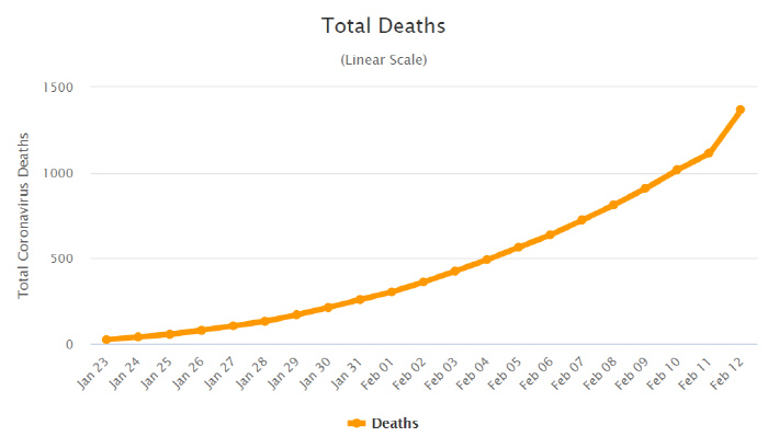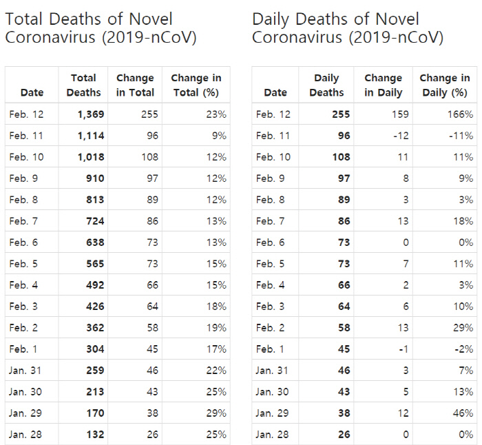 중국의 신종 코로나바이러스 감염증(코로나19) 누적 사망자 숫자가 12일까지 1300명이 넘었고 확진자는 6만명에 육박한다. 사망자 증가율이 낮아지는 추세를 보이더니, 진단법이 바뀌면서 이날 감염자와 사망자 모두 급증했다.