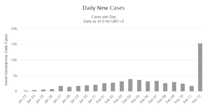 그러다가 2월 12일 감염자, 사망자 모두 급증했다. 특히 신규 감염자 수는 전날 1638명에 비해 거의 10배가 늘었다. 중국 언론들이 당국의 설명을 인용해 보도한 것으로 보면 감염자 판단 기준을 바꾼 것이 숫자가 늘어난 가장 큰 이유로 보인다.
