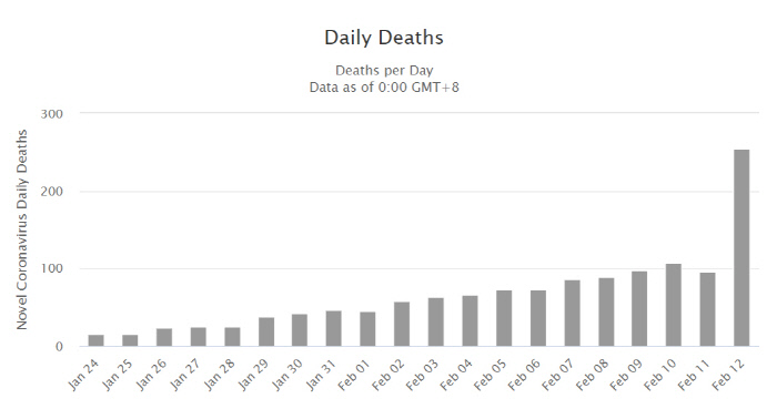 그러다가 2월 12일 감염자, 사망자 모두 급증했다. 특히 신규 감염자 수는 전날 1638명에 비해 거의 10배가 늘었다. 중국 언론들이 당국의 설명을 인용해 보도한 것으로 보면 감염자 판단 기준을 바꾼 것이 숫자가 늘어난 가장 큰 이유로 보인다.