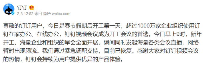 중국판 트위터인 웨이보에는 “2020년에 우리집 인터넷은 왜 이렇게 느리냐”는 글들이 잇달아 올라왔다. 사용자들은 원격근무(#WorkingRemotely)라는 해시태그를 붙여, 턱없이 느려진 인터넷 속도를 지적했다. 알리바바의 업무용 통신서비스인 딩토크(딩딩)는 지난 3일 잠시 서버가 다운됐고, 텐센트의 위챗워크와 화웨이의 위링크 같은 비슷한 업무용 툴들도 장애를 빚었다. 중국 디지털화의 한계를 보여준다는 지적이 나왔다. 반면 발빠르게 적응해가려는 회사들도 있었다. 바이트댄스는 화상회의 기능 등이 포함된 ‘페이슈’라는 원격근무용 무료 통신서비스를 개통했고, 직원들 건강상태를 체크하는 일일 건강보고 프로그램을 내놓기도 했다.