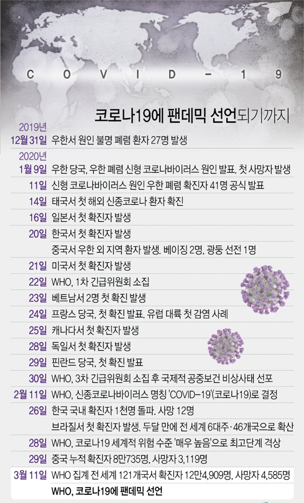 걷잡을 수 없이 감염증이 퍼지자 세계보건기구(WHO)가 결국 코로나19의 팬데믹(세계적 대유행)을 선언했다. 테워드로스 아드하놈 거브러여수스 WHO 사무총장은 11일(현지시간) 스위스 제네바 WHO 본부에서 기자회견을 열고 “코로나19를 ‘팬데믹’으로 규정할 수 있다는 평가를 내렸다”고 밝혔다. 앞으로 며칠에서 몇 주 사이에 감염자와 사망자, 피해국가가 늘어날 것이라면서 “단순한 공중보건 위기가 아니라 모든 분야에 영향을 미칠 만한 위기”라고 했다.