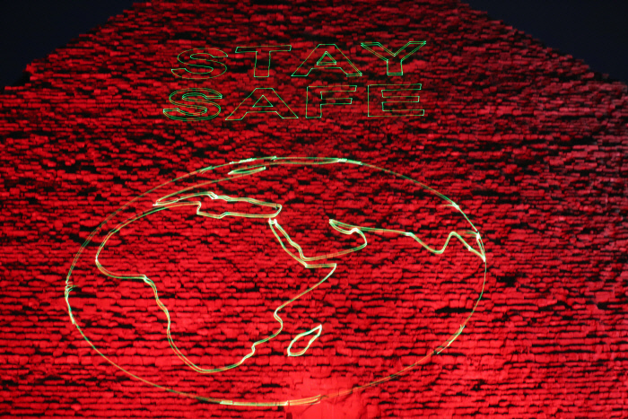 이집트투데이 등 현지 언론들에 따르면 30일(현지시간) 카이로 근교 기자(Giza)의 대(大)피라미드에 코로나19 위기를 겪고 있는 세계에 보내는 연대의 메시지와 이동을 자제할 것을 권고하는 글이 레이저로 표시됐다. 이집트 문화유물부가 주관한 특별 레이저쇼다.