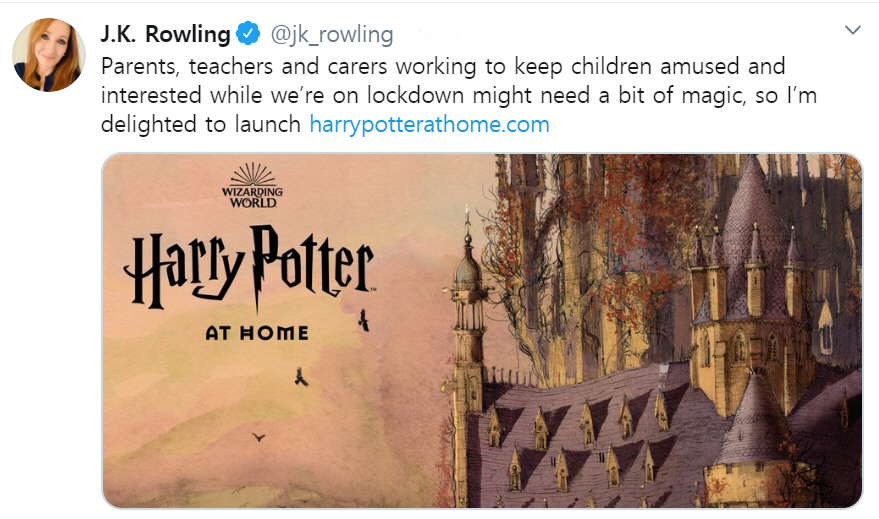 <해리 포터> 시리즈를 쓴 영국 작가 J.K.롤링이 이달 초 웹사이트를 새로 열었다. 사이트의 이름은 ‘해리 포터 앳 홈’, 코로나19 때문에 집에 머물러야 하는 아이들을 위한 해리포터 ‘집콕’ 버전이다. 롤링은 1일(현지시간) 트위터에 “꼼짝할 수 없는 부모님과 선생님들에겐 아이들을 재미있게 만들어줄 마법이 조금 필요하다”고 적었다.