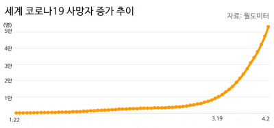 확산 초반에만 해도 코로나바이러스의 특성상 날씨가 따뜻해지면 계절성 인플루엔자처럼 잦아들 것으로 예상됐으나, 4월에 들어선 뒤에도 확산세는 꺾이지 않고 있다. 사망자도 5만명을 훌쩍 넘었다.