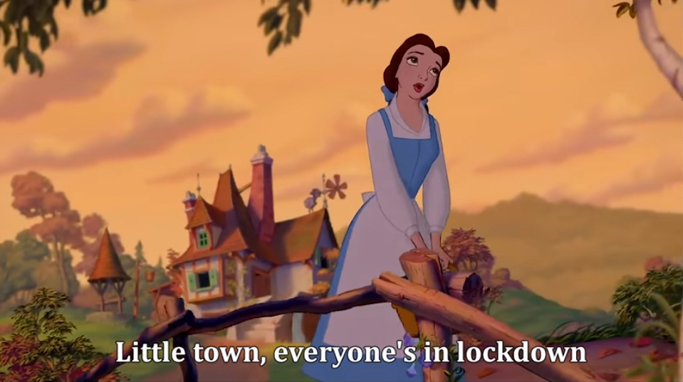 프랑스의 시골마을. 바구니를 든 아가씨가 집을 나서며 노래를 부른다. “온 마을이 록다운(봉쇄)됐네.” 이웃들이 집안에서 밖을 내다보며 외친다. “집에 머물러!” 그리고 전염병에 감염된 마을 사람의 소식이 이어진다. 애니메이션 <미녀와 야수>의 한 장면이다.