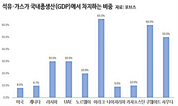 사우디와 아랍에미리트연합(UAE), 쿠웨이트 등 걸프 산유국들은 석유를 팔지 못하면 국가경제와 사회시스템이 운영되지 않는다. 이라크는 국내총생산(GDP)의 65%, 쿠웨이트는 60%, 사우디는 50%가 석유에서 나온다. UAE와 러시아는 GDP의 30%, 노르웨이는 20%, 카자흐스탄과 캐나다·나이지리아는 10% 정도를 석유에 의존한다.