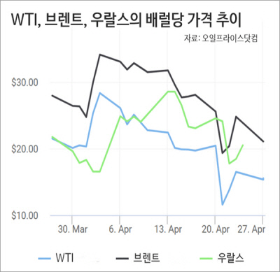 미국에서 거래되는 서부텍사스산원유(WTI) 선물 가격이 ‘마이너스’로 떨어진 지 일주일, 여전히 WTI는 15달러대이고 그보다 높은 가격대에 거래되던 브렌트유도 간신히 20달러 선을 유지하고 있다. 코로나19 ‘봉쇄’와 맞물려 유가가 이른 시일 내 반등하기는 어려워 보인다. WTI가 세계 유가의 동반 추락을 부르긴 했지만 원유도 생산지에 따라 특성이 다르고 ‘브랜드’에 따라 가격 추이에서도 조금씩 차이가 난다.