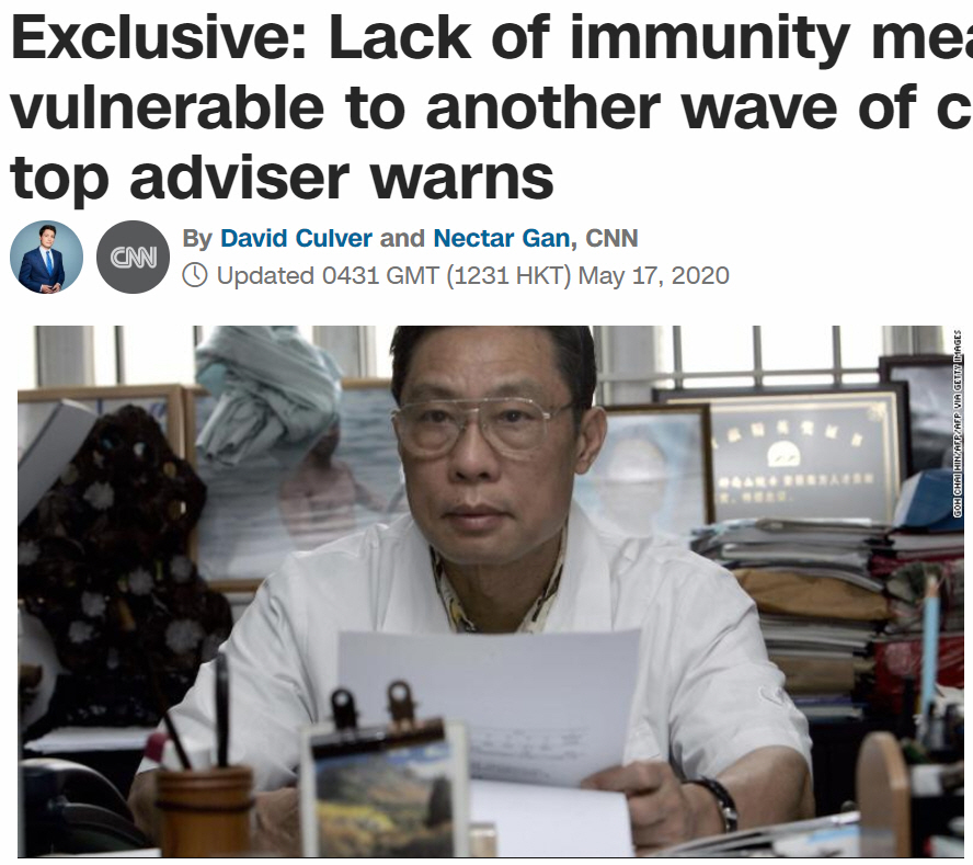 중국의 전염병 전문가인 중난산(鐘南山) 공정원 원사는 17일 미국 CNN 인터뷰에서 “중국인들의 면역 형성이 아직 부족하다”며 “다시 감염의 파도가 올 수도 있다”고 말했다. 그는 “중국인 대부분은 면역이 없는 탓에 코로나19 바이러스 감수성이 높은 상태”라며 “거센 도전을 마주하고 있다”고 말했다. 코로나19 확산세가 꺾이자 중국은 학교 문을 열고 공장을 다시 가동하기 시작했으나, 제2의 코로나19 물결이 밀어닥칠 가능성이 있는 만큼 안심해서는 안 된다고 중 원사는 경고했다.
