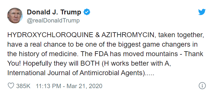 그럼에도 근거가 취약한 HCQ 옹호론은 트럼프 대통령과 정치적 후원자들을 통해 본격 확산되기 시작했다. 3월 19일 트럼프 대통령은 “클로로퀸과 HCQ는 말라리아 약으로 알려져 있지만 끔찍한 (코로나)바이러스에도 잘 듣는다”며 이 약을 첫 거론했다. 이틀 뒤 트럼프 대통령은 트위터에 HCQ와 아지트로마이신이 코로나19의 ‘게임체인저(결정적 변수)’가 될 것이라고 주장하는 글을 올렸다.
