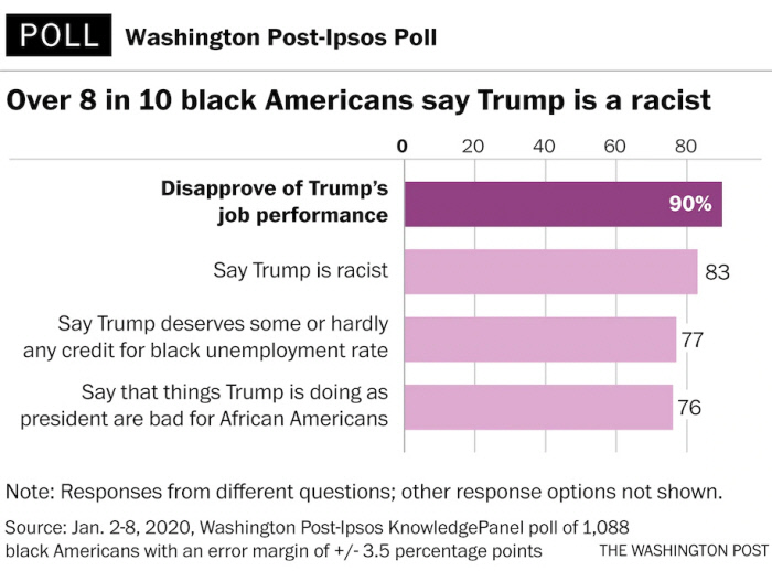 특히 트럼프 대통령 집권 이후 흑인들이 느끼는 차별은 더욱 커진 것으로 보인다. 지난 1월 갤럽 조사에서는 트럼프 집권 뒤 백인과 비백인의 행복도 격차가 커진 것으로 나타났다. 백인 90%는 현재의 행복도에 만족을 표시했으나 비백인의 경우 수치가 77%로 줄었다. 오바마 집권 때보다 11%나 낮아진 것이었다. 백인들의 75%는 자녀가 미국 사회에서 편안한 삶을 누릴 기회를 갖가질 것이라고 대답했지만, 흑인들 중 같은 응답을 한 사람은 16%뿐이었다. 비슷한 시기 워싱턴포스트-입소스 흑인 여론조사에서 응답자의 65%는 지금이 미국에서 흑인으로 살아가기에 ‘나쁜 시기’라고 답했다.