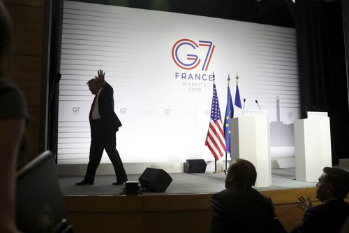 2019년 8월 26일(현지시간) 프랑스 휴양지 비아리츠에서 개최된 주요7개국(G7) 정상회의에서 도널드 트럼프 미국 대통령이 폐막 기자회견을 마친 뒤 연단을 떠나고 있다.  비아리츠 AP연합뉴스