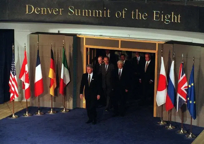 1997년 7월 미국 콜로라도주 덴버에서 열린 주요7개국(G7) 정상회의에 처음 참석한 보리스 옐친 러시아 대통령(앞줄 오른쪽)이 빌 클린턴 미국 대통령의 뒤를 따라 회의장에 들어서고 있다. 러시아는 이듬해부터 이 그룹의 멤버가 됐고 G7은 G8로 확대됐다. 덴버포스트