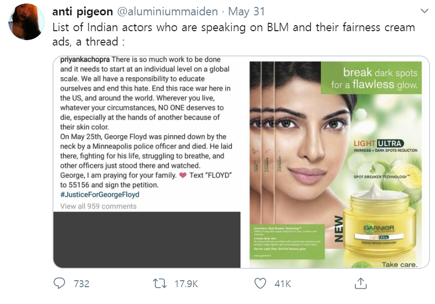 미스월드 출신의 발리웃 스타 프리얀카 초프라는 얼마 전 인스타그램에 플로이드의 죽음을 애도하는 글을 올렸다. “미국과 세계의 인종 전쟁이 끝나기를. 어디에 살든 당신의 환경이 어떻든, 피부색 때문에 타인의 손에 목숨을 잃어야 할 이유는 없다.” 문제는 그가 과거에 출연했던 광고와 영화였다. 인스타그램 사용자들은 초프라가 피부를 하얗게 만들어준다는 ‘집중 미백영양제’ 광고를 했던 점, 2008년 ‘패션’이라는 영화에서 흑인 남성과 성관계를 갖는 걸 수치스러워하는 캐릭터로 등장했던 점을 꼬집었다. 소남 카푸르 아후자, 디피카 파두코네, 디샤 파타니 등 여러 배우들이 플로이드 애도 글을 올렸다가 초프라처럼 미백화장품 광고를 찍은 것 때문에 비판을 받았다.