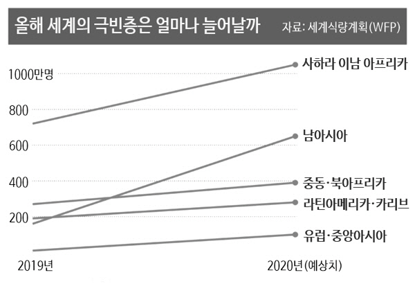 지난 4월 유엔 세계식량계획(WFP)은 저소득·중위소득 국가에 살고 있는 2억6500만명이 코로나19 때문에 식량위기를 겪을 수 있다는 예측을 내놨다. WFP는 ‘2020 식량위기 글로벌 보고서’에서 만성적으로 식량이 모자라는 인구가 약 1억3500만명인데 팬데믹 때문에 2배로 늘어날 수 있다고 지적했다. 보고서는 4월에 발표됐지만 작성된 시점은 세계보건기구(WHO)가 코로나19를 ‘팬데믹’으로 선언하기 전이었다. 그럼에도 지구적 식량위기 경고하면서 국제사회의 시급한 행동을 촉구했던 것이다.