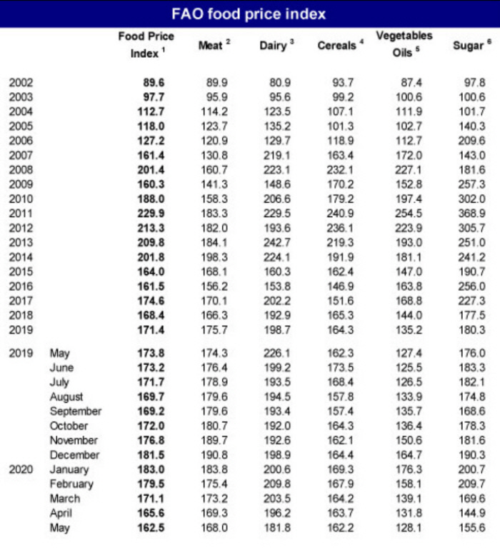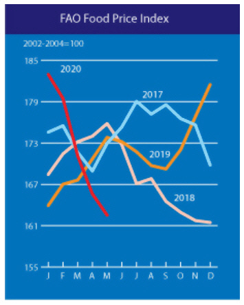 정작 4월과 5월 세계 식량가격은 내려갔다. 곡물, 기름 생산용 종자, 육류와 설탕 등을 종합한 5월의 FAO ‘식량가격지수’는 162.5로 1월의 183.0에서 급락했다. 육류는 올들어 183.8에서 168.0으로, 유제품은 200.6에서 181.8로 떨어졌다. 바이오디젤과 바이오에탄올의 연료인 대두와 옥수수, 사탕수수는 수요가 급감하며 가격이 내려앉았다. 하지만 주곡 값은 변동이 적었고, 쌀값과 밀값은 4월에 다소 올랐다. 베트남과 러시아가 코로나19를 이유로 각기 쌀과 밀 수출을 제한한 탓이다.