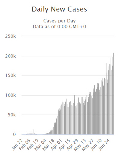 이날 미국에서는 신규 감염자 5만5220명이 확인됐다. 플로리다주에서만 1만명 넘는 신규 환자가 나왔다. 텍사스주에서 약 8000명, 캘리포니아주에서 6000여명이 감염된 것으로 나타났다. 경제활동 재개를 앞당긴 조지아주에서도 3500명 가까운 환자가 확인됐다. 워싱턴포스트 등에 따르면 미 전역의 하루 신규 확진자는 사흘 연속으로 5만명을 넘겼다. 미국의 누적 감염자 수는 280만명을 웃돈다.