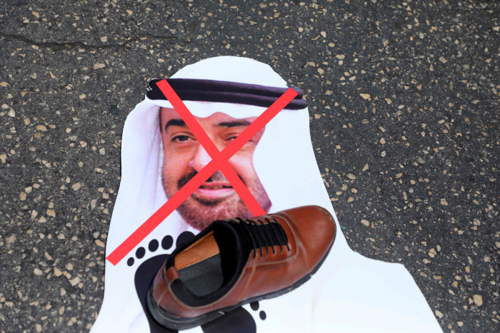 14일(현지시간) 팔레스타인에서는 UAE가 이스라엘 편에 선 것에 항의하는 시위가 곳곳에서 열렸다. 시위대는 UAE와 이스라엘 깃발을 함께 불태우면서, 길 바닥에 UAE를 실질적으로 통치하는 아부다비 왕세제 모하메드 빈 자예드의 사진을 붙이고 발로 밟았다. 1980년 이집트, 1994년 요르단에 이어 26년만에 ‘이스라엘과 수교하는 아랍국’이 된 UAE의 결정을 이끈 사람이 모하메드 왕세제이기 때문이다.