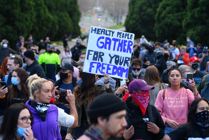 5일(현지시간) 호주 곳곳에서는 ‘록다운(봉쇄) 반대’ 시위가 벌어졌고 10여명이 체포됐다. 멜버른에서는 300여명이 방역조치에 항의하며 행진을 했고 시드니, 브리스번, 애들레이드, 퍼스 등 대도시들에서 비슷한 항의시위들이 잇따랐다. 전날 스콧 모리슨 총리는 전국 8개 주·영토 가운데 7곳에서 12월까지 ‘주 내 이동’을 허용할 수 있을 것이면서 “백신이 없는 상태에서, 앞으로 몇년 동안 이렇게 살아야 할 수도 있다”고 경고했다. 봉쇄가 장기화될 수 있다는 말이 일부 주민들의 분노를 자극한 것으로 보인다. 멜버른의 시위대는 미국 흑인들의 구호를 본뜬 ‘인권도 중요하다’는 구호와 ‘자유’를 외치며 행진을 했다.