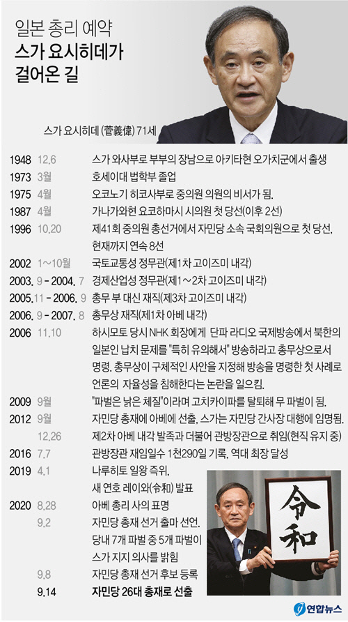 스가 총재는 15일 간사장과 정조회장 등 당 인사를 발표한 뒤 16일 국회에서 총리로 선출된다. 그날 곧바로 신임 내각이 발표될 예정이다. 일본 언론들은 스가 장관이 근 30년만의 ‘무(無)파벌, 비(非)세습’ 총리가 될 것이라는 점에 의미를 부여했다.