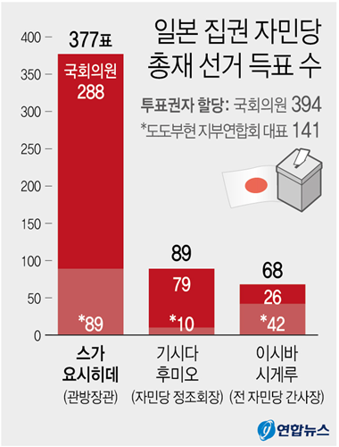 아베 총리가 8월 말 물러나겠다고 한 직후부터 스가 신임 총재는 차기 총리로 유력시됐다. 실제로 이변은 없었다. 무효표를 빼고 534표 가운데 377표(70.5%)를 얻었다. 기시다 후미오(岸田文雄) 정조회장은 89표를 득표했다. 최대 패자는 이시바 시게루(石破茂) 전 간사장이다. 겨우 68표로 세 후보 중 꼴찌였다.